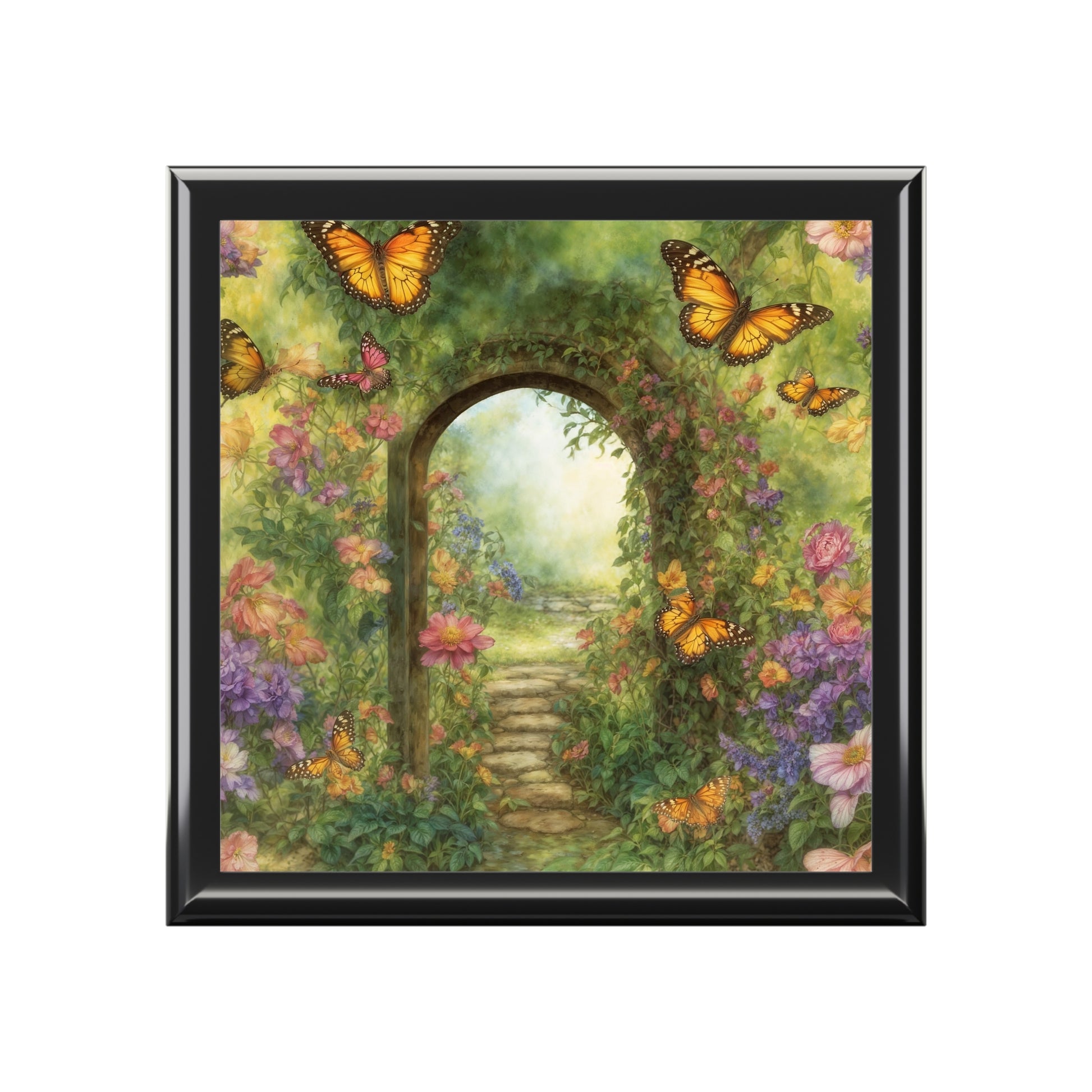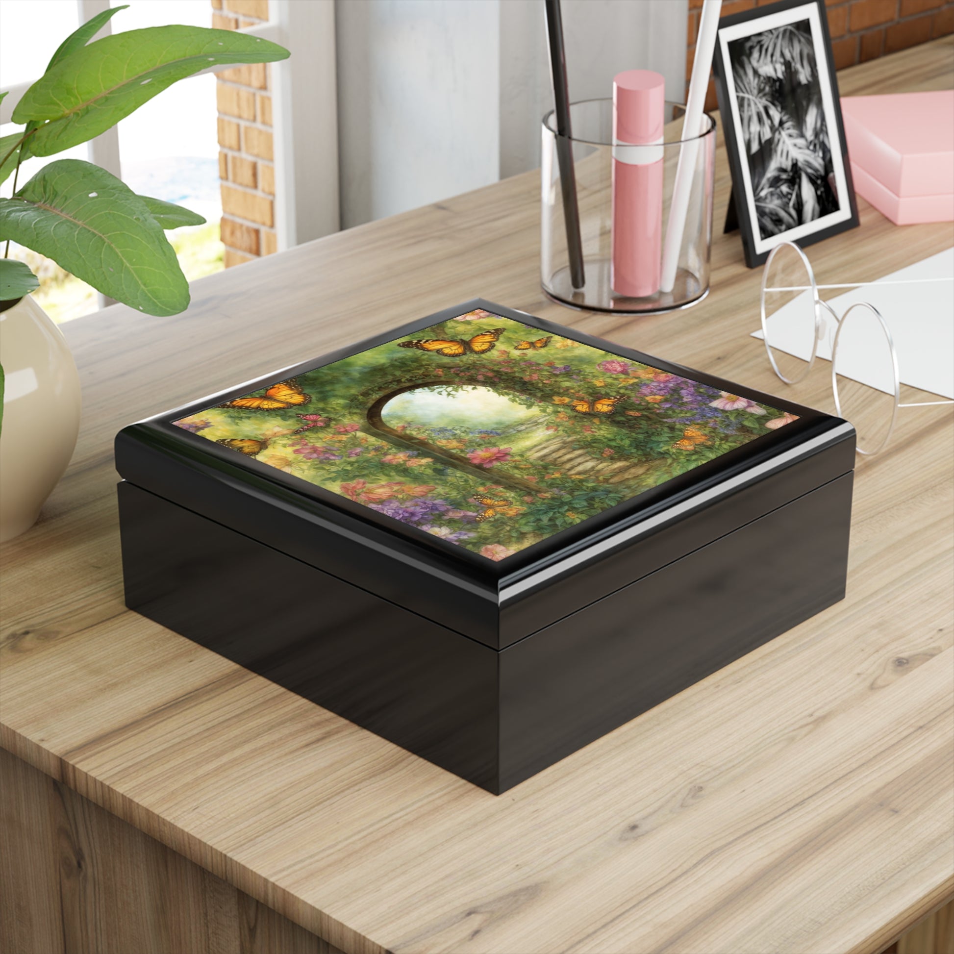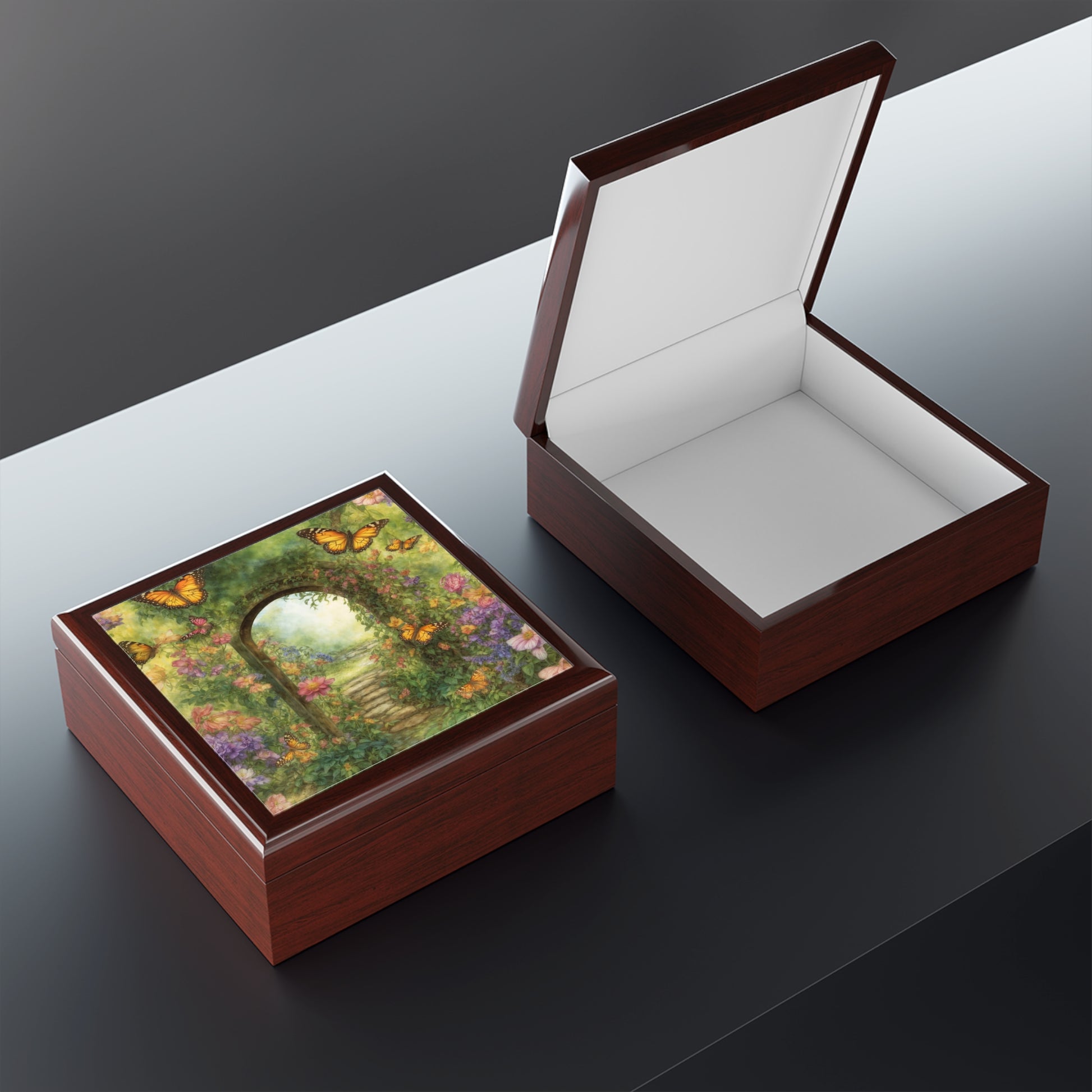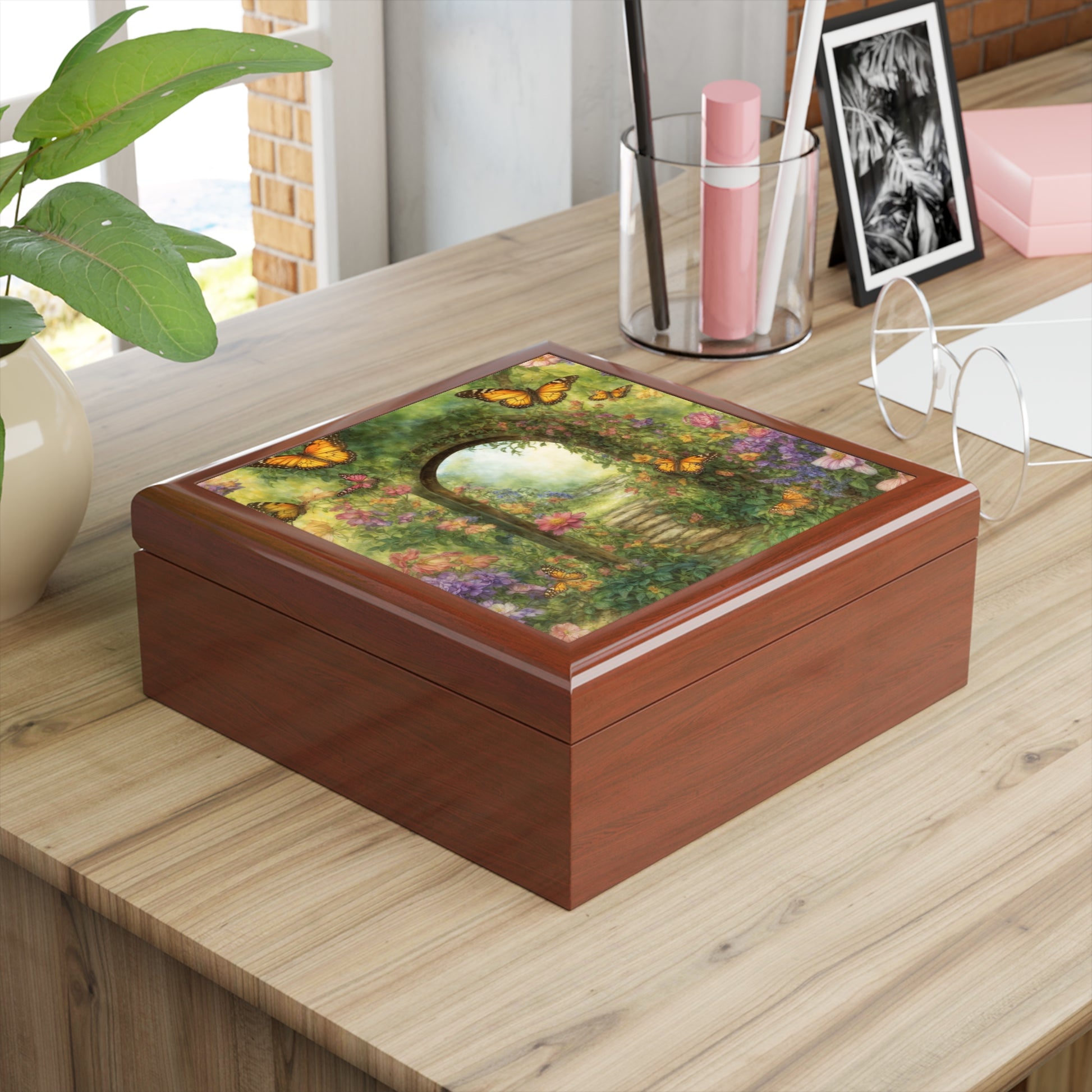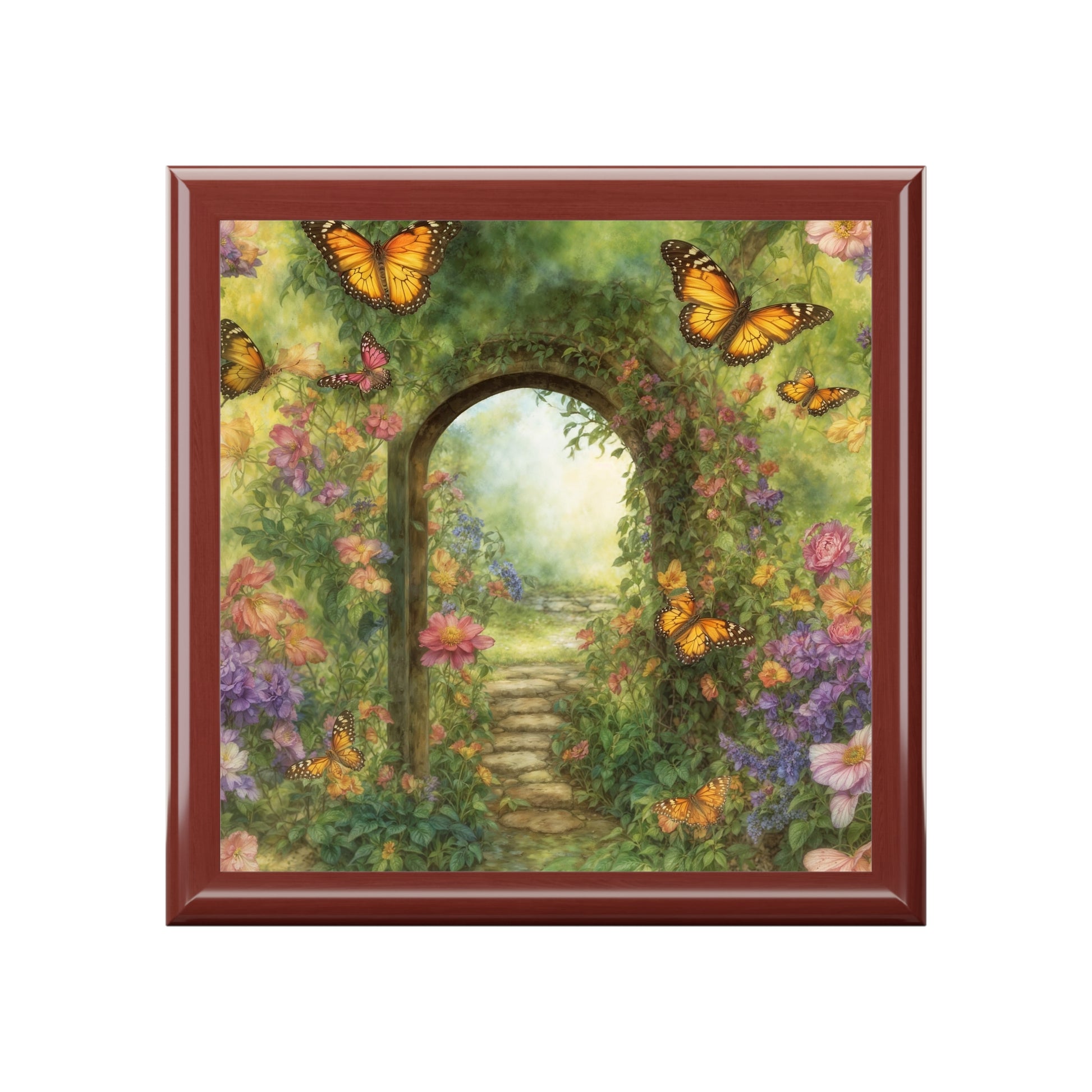 .: 6" x 6" (15cm x 15cm) decorated glossy ceramic tile fitted on top of the lid